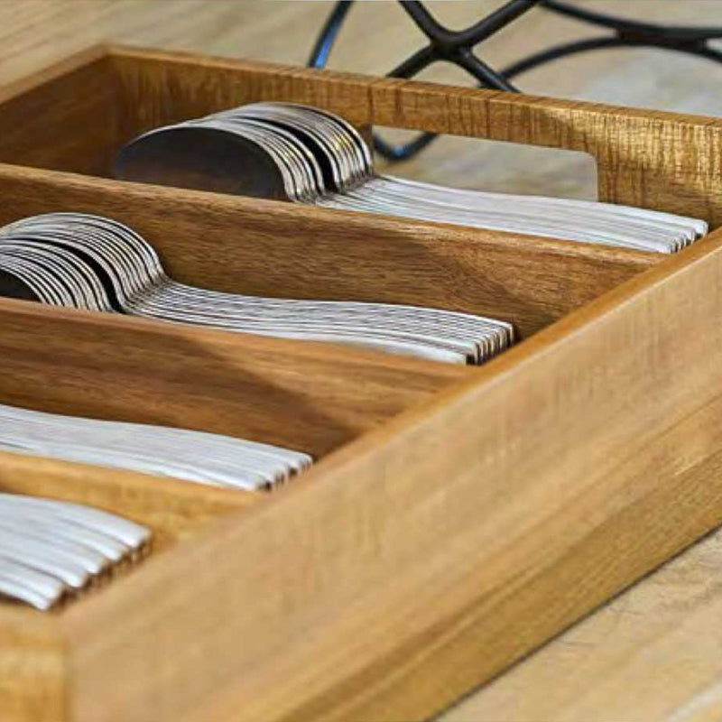 Caixa de madeira para talheres, ideal para buffets. Inclui 4 compartimentos para uma melhor organização. Está equipada com alças confortáveis para um transporte sem esforço e pés antiderrapantes para garantir a estabilidade durante a utilização.